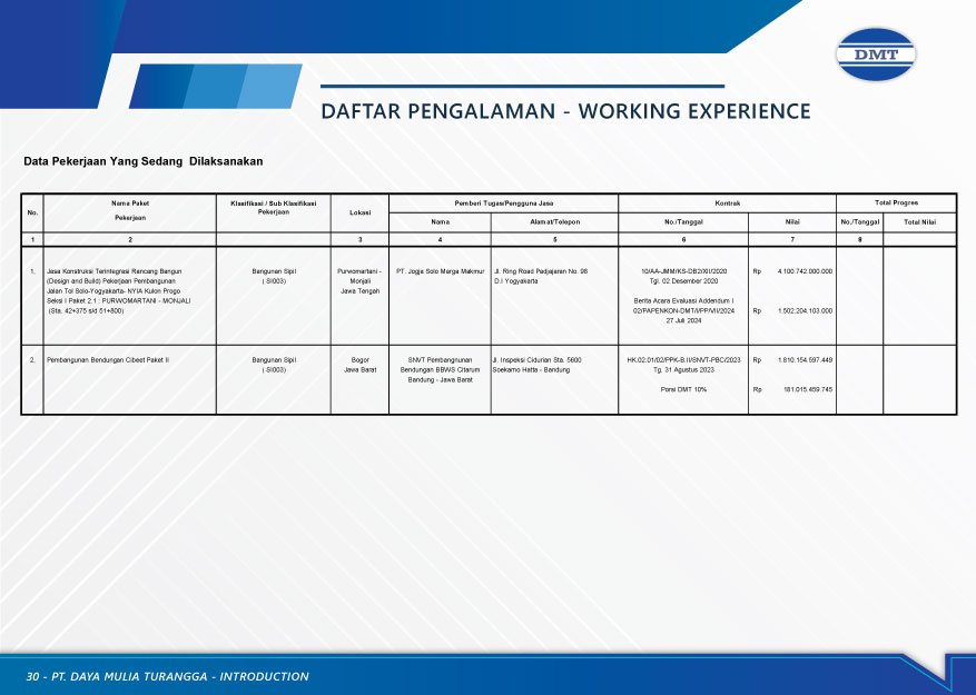 PT. DAYA MULIA TURANGGA was established in 1986 and since has undertaken a number of Project successfully in constructing highway, bridges and commercial building in Sumatera, Java, Kalimantan, Sulawesi, Bali, West Nusa Tenggara, East Nusa Tenggara, Maluku and Papua.